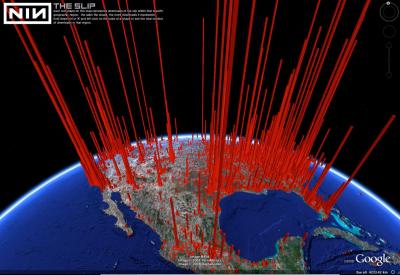 As noted in our recent article on music service Topspin, they recently assisted in the digital distribution of Nine Inch Nails' album The Slip. The distribution data from that release was then adapted by the NIN tech team into this awesome graphical representation in Google Earth. Love what NIN are up to with all this stuff.